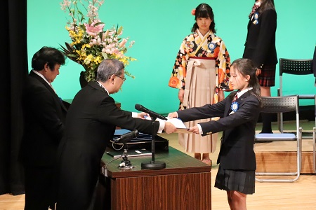 在校生の大きな手拍子に迎えられて、背筋をピンと伸ばし、しっかりした足取りで卒業生が入場しました。渡辺校長から「初等学校はみんなにとって、かけがえのない時間をすごしたかけがえのない場所。そしてこれからはみんなの帰る場所になります。卒業して中学生になっても、高校生になっても、またここに帰ってきてください」と卒業生への言葉が贈られました。この日舞台に立ち、一人ひとり卒業証書を受け取る卒業生の姿はとても大人っぽくしっかりして見え、初等学校の6年間で立派にたくましく成長したことを感じさせてくれました。
