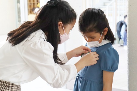 入場前の一コマ。6年生が新入生の服装や身なりをチェック
