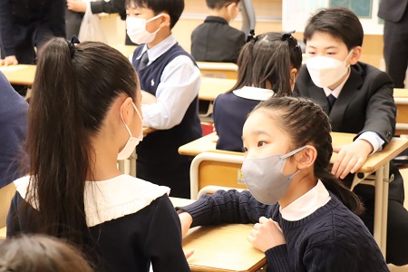 初等学校には色々な場面でその時の気持ちを表現するオリジナルの曲がたくさんあります。入学式では、新入生を歓迎する気持ちが込められた歌を在校生全員で披露していますが、昨年に引き続き今年も感染予防対策のため講堂内での歌唱は控え、事前に録音した『入学式の歌』を流しました。
