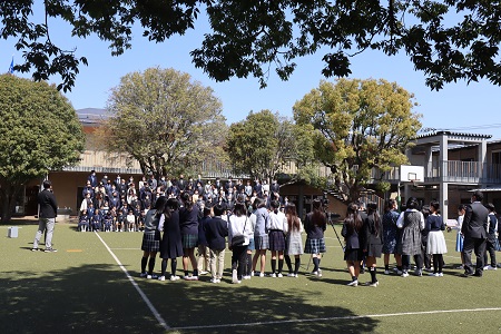 4月8日(金)、入学式が初等学校講堂で行われ、108人の新入生を迎えました。初等学校には、1年生から6年生までのクラスで構成される「青」「赤」「緑」のグループがあり、この縦割りのグループで様々な活動を行っていきます。入学式もこのグループごとに3回に分けて行いました。