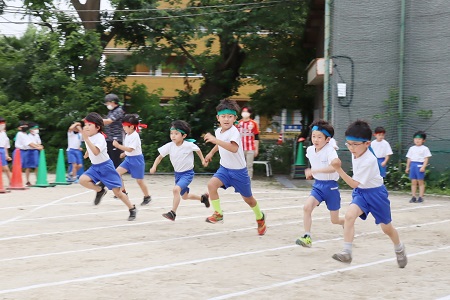 6年生の開始宣言、準備体操を行ったあと、4、5、6年生による50m走が行われました。順位を競うものではなく、一人ずつタイムを計測しました。各自が練習の時のタイムを上回るべく、一直線にゴールを目指し、全力で走り抜けました。その後は、1、2、3年生による学年ごとの徒競走。1年生は初等学校での初めての合同体育です。スタートラインに立つ1年生は緊張からか少し硬い表情でしたが、全員全力で駆け抜けゴールすることができました。