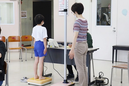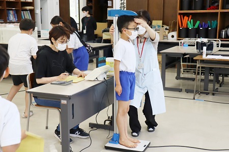 クラスごとに検診会場の教室を順番にまわって先生の診断を受けていきます。検診や計測が一通り終わったら、その結果を先生とお話しする「からだのお話コーナー」へ。「1年でこんなに背が伸びたよ、すごいね!」「歯がしっかり磨けていますね。6年まで虫歯ゼロですごせるようにしようね」「目が疲れたらすこし休めましょう」。先生が結果内容を確認して保健指導をしてくれました。