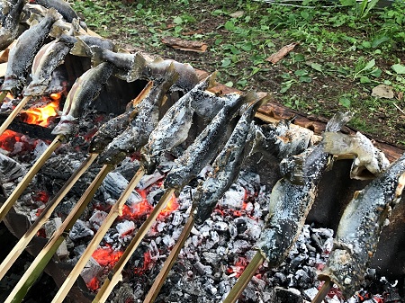 岩魚掴み取り体験:在来種の岩魚を掴み取りし、絞めてさばいて塩焼きに。