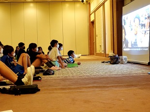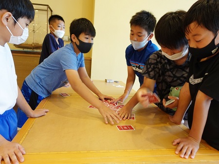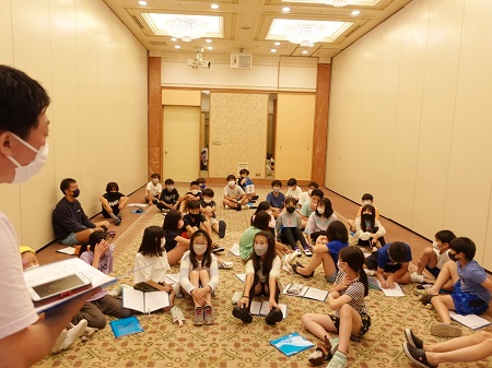 海で泳いだ後は、ホテルの広間に集まってカードゲームやおしゃべりをして、自由時間を過ごしました。