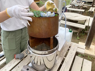 3日目の最終日、ホテル内の葉っぱを摘んで、エッセンシャルオイル作りをしました。水上の香りをおみやげにしました。