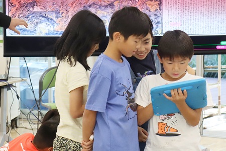 続いては、江戸時代の浅草へタイムスリップ。大きなモニターに、江戸時代に起きた「安政江戸地震」の様子が描かれた絵が映し出されました。加納先生より、地震の後に火事が起きた様子が絵と文字で残されていることを教えてもらい、絵から読みとれることについて解説いただきました。