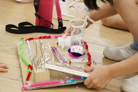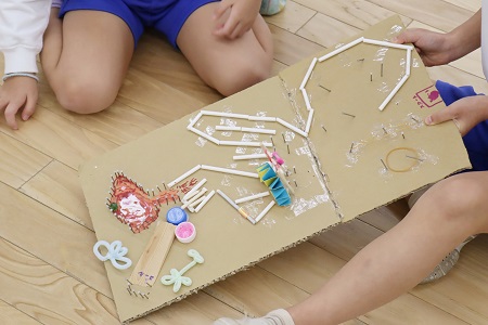 「わぁー、むずかしいけど面白い!」12月11日、学校の工芸の授業で、僕とクラスのみんなで「ビー玉くんの大ぼうけん」というテーマの名前で、1年生に楽しんでもらう遊びをつくりました。どうしてかというと、1年生に楽しんでもらえる遊びをつくることが課題だったためです。