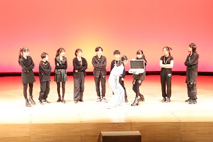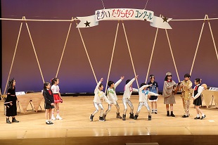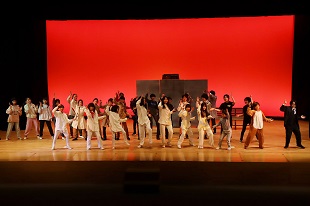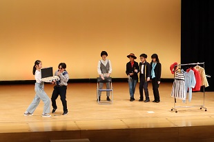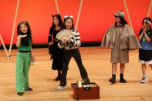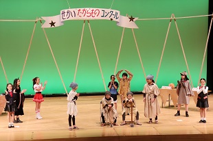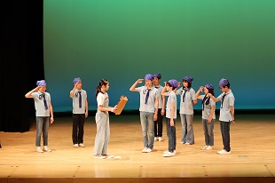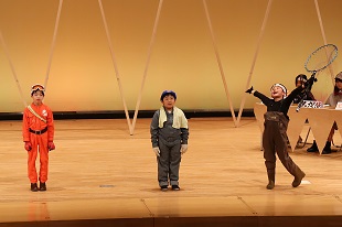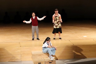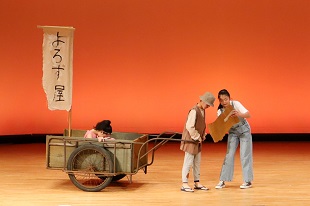 舞台は「世界宝物コンクール」の会場。世界各国の代表が「これこそ宝物!」と思うものをおのおのが持ち寄り、審査員にプレゼンテーションしています。月の水や空飛ぶじゅうたん、財宝、恐ろしい爆弾をいかにすばらしい宝か訴える国もあれば、お年寄りや精いっぱい働くこと、子どもたちこそが世界の宝だとアピールする国もあり、国によって価値観はさまざま。「ほんとうの宝物」は何か、演じる葵組と観客が一緒に再確認していく内容になっています。会場全体に通る声と体全体を使った元気いっぱいの演技が魅力的で、観客との掛け合いもあり、見る人を葵組の表現する世界へ惹きつける素敵な劇を披露しました。