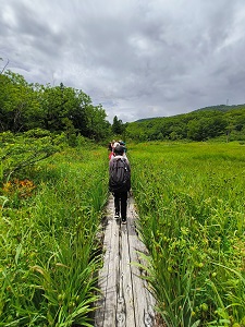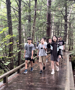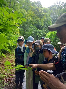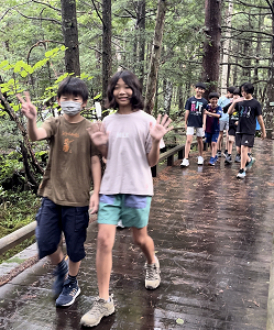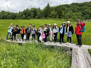 4年生2日目は玉原湿原散策です。玉原湿原ではガイドさんにもついてもらって、様々な植物の名前、森のこと、小鳥のことなどを教わりました。「下に敷いてある木の道は自然を守るためなんだよ、でも鹿さんたちは自分の道を歩くんだよ」いろんなことをたくさん学びます。