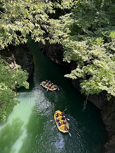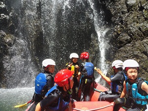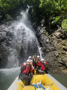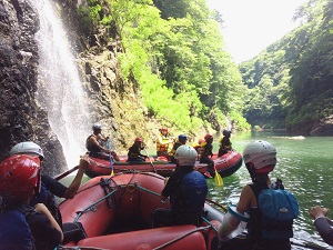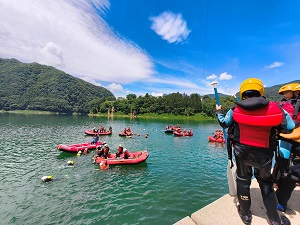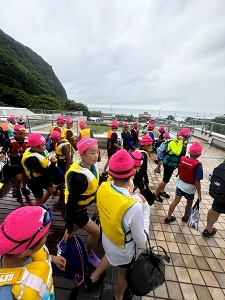 レイクラフティングでは、ウエットスーツをはじめ、多くの持ち物、着替えなど、子どもたちが理解して準備することが詰まっています。担任団もあえて詳しく説明するのではなく、ホワイトボードに書かれた情報を基に準備を進めるなど、子どもたちの自主性が発揮される取り組みで進めました。子どもたちも宿泊生活に慣れ、自分たちでしっかり準備をして予定時刻より早くレイクラフティングを行うことができました。天気も好転し、快晴の中湖に漕ぎ出します。インストラクターの方に教わりながら、息を合わせて湖をグングン漕いでいきます。途中、近くの船と水を掛け合ったりしつつ、暑さ対策も兼ねて湖で泳ぐ体験、渓谷の奥にある滝まで漕いでいく班などそれぞれの楽しみ方ができました。最後は全班でゴールまで漕ぐレースをするなど、充実した時間を過ごせました。