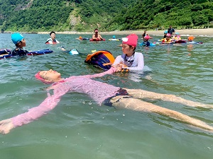 活動のクライマックスは、1時間に及ぶライフジャケット泳です。足のつかない深さの場所を、バディと協力しながら1時間泳ぎ続けます。はじめは両方がライフジャケットを身に着けているのですが、途中からは片方の子のライフジャケットは回収されてしまいます。一着のライフジャケットを互いに脱ぎ着しながら、体力を保ち続けられるように支え合います。