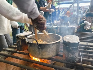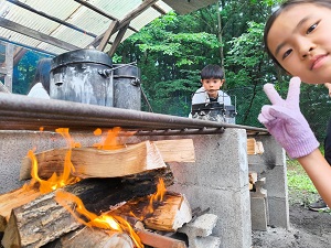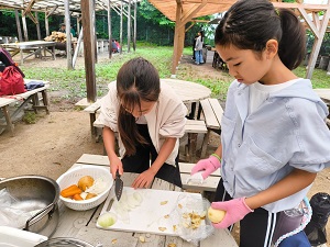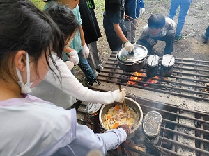 夕方から班ごとにご飯を飯盒で炊き、材料を切り、カレー作り。火を起こすところからチャレンジしました。飯盒炊爨ではうまく炊けた班も、焦げちゃった班も。カレーは現地の方のアドバイスを生かし、具材を薄目に切ることで美味しくできました。多少失敗しても、自分たちで作ったカレーは格別に美味しかったようです。