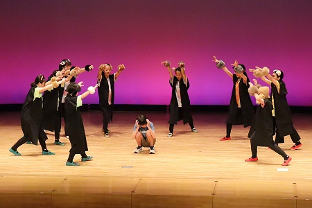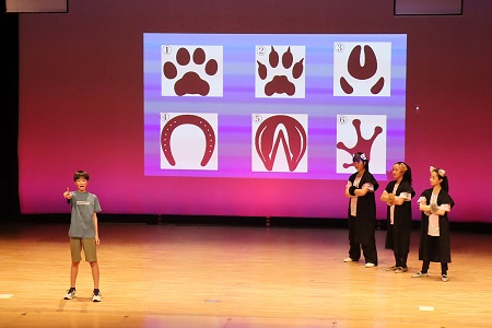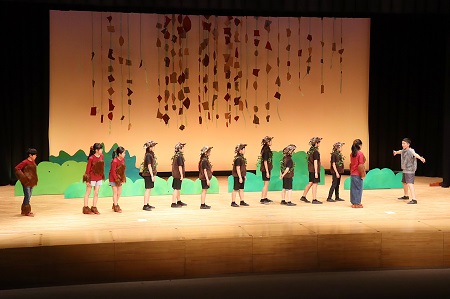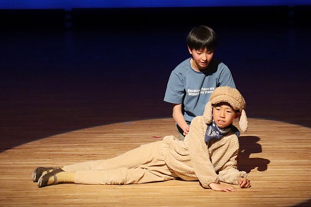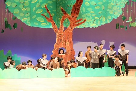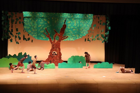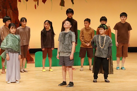 一匹だけみんなと違う毛色のジョージはチンパンジーたちの仲間に入れえもらえずいつも一人で過ごしていました。そんなジョージの唯一の味方はジャングルの真ん中に立つ大きな木の「長老」だけ。長老はジョージに「心をひらいて」とアドバイスしてある日突然去ってしまいます。ジャングルで遊ぶチンパンジーたちの前に、食べ物をねらうオランウータン親子、ジャングルを乗っ取ろうとするマントヒヒが次々と現れて…ジャングルの仲間たちを守るためにジョージが起こした行動とは。本リハで「がんばれー!」と上級生に激励のエールが贈られて登場した桂組の子どもたち。初めての劇の会を堂々と元気いっぱいに演じてくれました。