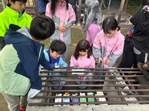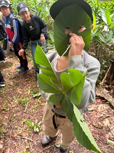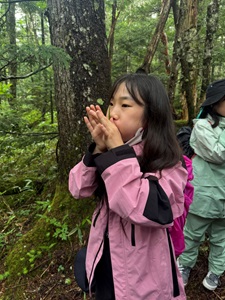 トラッキングでは、森の空気を感じながら、自然の魅力をたっぷり味わいました。ガイドさんから笹の葉を使って音を鳴らす方法を教えてもらい、友だちと一緒に音を出すことを楽しみました。吹き方や葉の角度によって音が変わることに驚き、「もっと上手になりたい!」という声を聞くことができました。また、森の中では、毒キノコを見つける場面もありました。見た目がきれいでも食べられないこと、むやみに触らないことなど、実際に見ながら学べたことはとても貴重でした。写真や図ではわからない「本物の自然」にふれることで、子どもたちは五感を使いながら多くのことを感じ取り、学んでいました。