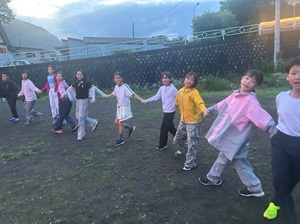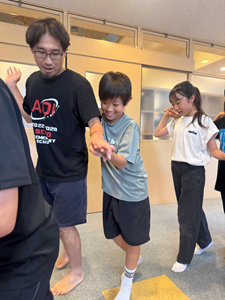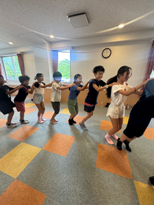 フォークダンスでは、曲に合わせて手を取り合いながら踊り、クラスをこえて笑顔が広がる時間となりました。最初は照れていた子どもたちも、音楽が流れると次第にリズムに乗り、楽しそうに体を動かしていました。活動の終わりには自然と拍手が起こり、あたたかい雰囲気に包まれました。