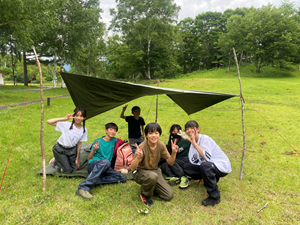 「サバイバルアドベンチャー」は身の回りのものを上手に使う、課題解決型ワークショップ。やり方は…教えません!お手本と用具だけ与えられて、雨風をしのぐテント(タープ)張りと煮沸のための火起こし。テントの構造と力のかかる仕組みや、コミュニケーションの大切さを学びました。
