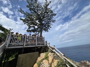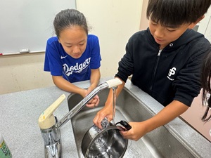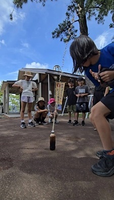 「黄金岬散策」では、岬の美しい景色を眺めながら、高台から海や地形を見渡し、地理的な特徴や歴史についてクイズ形式で楽しく学びました。子どもたちは「えー!そうなんだ!」と驚きながら積極的に答えており、自然の中での学びに目を輝かせていました。また、砂の入ったペットボトルを使って山の地層の重なりを観察したり、メントスとコーラを使って火山の噴火を模した実験を行ったりと、五感を使った理科的な学習も取り入れられ、楽しみながら深く学ぶ時間となりました。