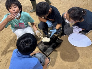 その後に訪れた「土肥金山」では、かつて金を採掘していた坑道の見学や、実際に砂金採り体験を行いました。天井の低い坑道の中を歩きながら、金を掘り出していた当時の様子を肌で感じ、歴史に対する興味を深めることができました。砂金採りでは、ざるを使って砂をすくい、水の中でゆすりながら、きらりと光る小さな砂金を一粒一粒探し出す楽しさを味わっていました。「見つけた!」「これ金じゃない?」と、歓声をあげながら夢中で取り組む姿が印象的でした。