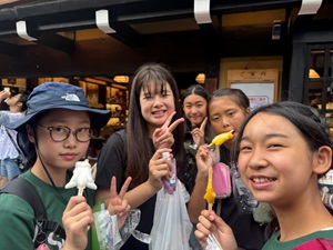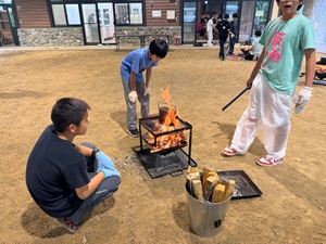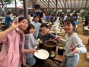 4日目は、岐阜県・飛騨高山の町並みを散策しました。伝統的な建物が立ち並ぶ通りを、グループに分かれてのんびり歩きながら、名物グルメの食べ歩きや家族へのお土産選びを楽しみました。風情ある木造の建物が立ち並ぶ通りでは、飛騨牛のにぎりやみたらしだんご、地元のスイーツなど、どれも美味しくて大満足の様子でした。友だちと会話を弾ませながら、楽しいひとときになりました。夜ご飯は、飯盒炊爨に挑戦しました。3日目のサバイバルアドベンチャー体験で学んだ火の起こし、具材準備、お米炊きとグループに分かれて、協力してカレーライスを作りました。普段はなかなか経験できない「ゼロから作る」食事に、最初は戸惑いながらも、力を合わせて作り上げました。出来上がったカレーをほおばる子どもたちの顔には、達成感と満足感があふれていました。自分で作ったカレーはやっぱり美味しいよね。夜は、キャンプファイヤー。日が暮れてあたりが暗くなる中、代表の子どもたちによって、火が灯されました。火を見ながら歌を歌ったり、フォークダンスをしたり、最後の夜を楽しみました。学年全員で輪になって手をつなぎ、音楽に合わせて楽しむ。思い出に残る最後の夜になりました。