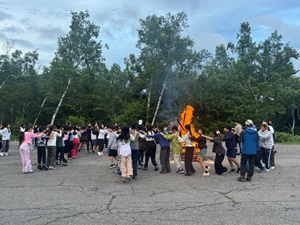 「キャンプファイアー準備」キャンプファイアーと言えば、フォークダンス。定番ですが「ジェンカ」「マイムマイム」「オクラホマミキサー」を桐ちゃん(桐谷先生)よりご指導いただきました。ただ踊れるようになるだけではなく、それぞれのダンスの文化も学びました。