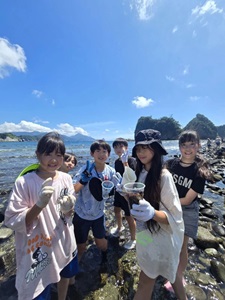 潮溜まりの動画鑑賞では、前日に体験した堂ヶ島のトンボロ現象を思い出しながら、潮の満ち引きや生き物のくらしについて、理科的な視点で話し合いました。「昨日見たあの貝と同じだ!」「ハゼを捕まえたかったんだよね!」といった声も聞かれ、学びがつながっていることを感じました。