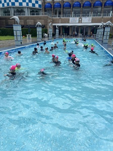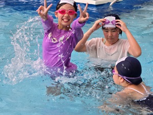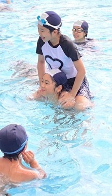 プールでは、まっすぐ泳ぐ練習をしたり、自由時間には水中じゃんけんやターンの練習、水のかけ合いなどで大いに盛り上がっていました。ふだんの授業では見られないような笑顔があふれ、心も体もリフレッシュしている様子でした。