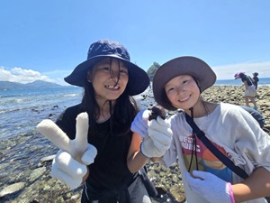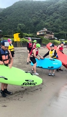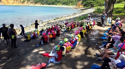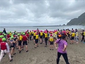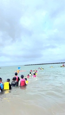 台風が接近しており、事前の天気予報では初日から雨とのことでした。しかし、子どもたちや保護者の皆さんの日頃の行いのおかげか、活動時間中は快晴に恵まれました。海に入ると、水温が心地よく、絶好のトンボロ日和でした。