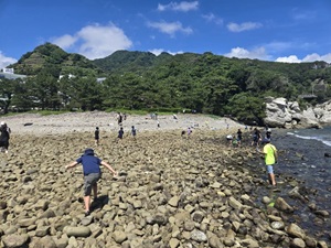 堂ヶ島では、干潮の時間帯にだけ現れる「トンボロ現象」を利用して、磯に渡り、自然の生き物とふれあいました。子どもたちはカニやヤドカリ、ナマコ、アメフラシなど、普段なかなか出会えない海の生き物を夢中になって探し、捕まえたり観察したりしました。最初はぬるっとした感触に戸惑い、恐る恐る触っていた子も、時間が経つにつれ「見て!こんなの捕まえた!」と次々に嬉しそうに報告してくれるようになり、最後には手際よくカニを捕まえるほどに慣れていました。自然とふれあうことで、子どもたちの表情がどんどん生き生きとしていくのが印象的でした。