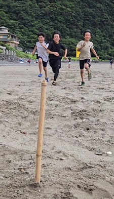 午後は、海やプールで自由に遊ぶ時間を楽しみました。ビーチフラッグで思い切り走ったり、友達と水をかけ合ったり、プールでは騎馬を組んだり、ターンや泳ぎのフォームを練習したりする子もいました。それぞれが思い思いの時間を過ごし、笑顔があふれるひとときとなりました。