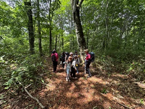 2日目のスタートは、玉原高原の自然散策から。天候と時間の関係で、行き先はガイドさんと相談しながらグループごとに決定。湿原を目指すチームもあれば、熊の痕跡を探すチーム、昆虫観察に夢中になるチームなど、それぞれのテーマで自然と向き合う時間となりました。