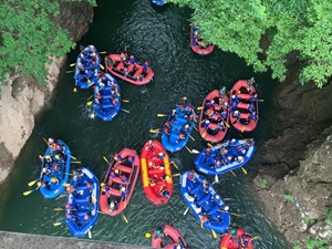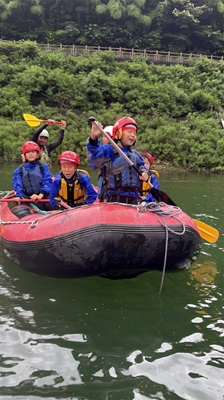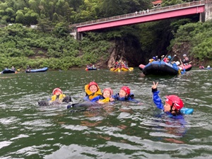 午前中は赤谷湖でレイクラフティングに挑戦しました。ウエットスーツに身を包み、ボートに乗り込み、みんなで力を合わせて漕いでいきます。途中で泳いだり、水を掛け合ったりと、笑顔あふれる楽しい時間となりました。