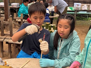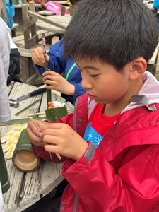 箸づくり体験では、木の手触りや削る感覚を楽しみながら、自分だけのオリジナル箸を作り上げ、自然の素材に触れながらものづくりの楽しさを味わいました。普段当たり前に使っている箸を1から作る大変さも自然の中にいるからこそ感じることのできた体験でした。