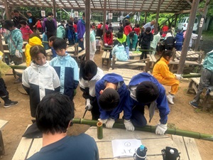 当初予定していた登山は、山の天候が不安定だったため、安全を最優先に考え、内容を変更し登山の代わりに「箸づくり体験」と「トラッキング」を実施しました。