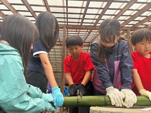 「竹を初めて使ったよ。外は全部ツルツルで、道具を使ったら簡単に割くことができたから楽しかったよ。」(HY)