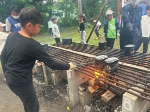 昼食は玉原高原の爽やかな風の中でいただき、その後はお待ちかねの飯盒炊爨!