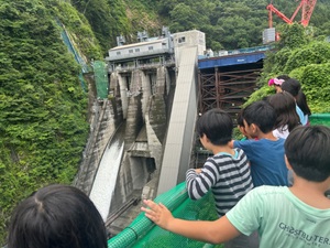 午後一番はクラスでお散歩。宿のすぐ近くにある赤谷湖の水門を見学しました。赤谷湖は堰止湖であり、ダムとしての役割についても考える機会となりました。普段なかなか見ることのない仕組みに、子どもたちも興味津々。