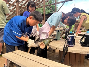 宿に到着したら、早速準備をして「竹の工作」に取り組みます。水上には自然が多く残されており、学校での学びをそのまま活かせる環境です。今回は、手入れの際に伐採された竹を活用して、オリジナルのコップとお箸作りに挑戦しました。