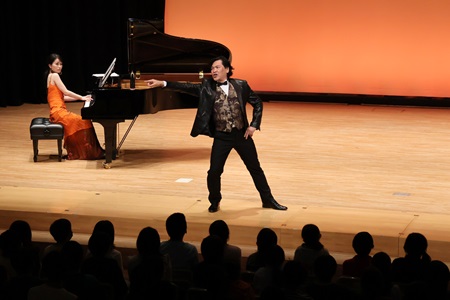 オープニング曲は、「フニクリフニクラ」。明るく迫力のある歌声が会場に響きました。ソプラノ、アルト、テノール、バスの四つからなる魅力的なハーモニーに、子どもたちも一気に引き込まれた様子。その後は、子どもたちも大好きな曲「君をのせて」、ソロ演奏、二重演奏と盛りだくさんのプログラムが続き、最後は音楽と演劇で構成されるオペラの曲を3曲演奏していただきました。