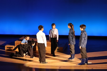 この劇の主役は犬たちです。様々な家庭で過ごす犬たち。その中の一匹は、人間の都合で保健所に連れて行かれることに。犬たちの目線で、時にコミカルに描かれる家族も、犬にとっては大切な飼い主であり、自分に愛情を注いでくれるかけがえのない人間たち。犬たちが「生まれ変わっても、あなたと」一緒にいたいと願っている一方で、人間は犬たちをどのように想っているのか…。「命」という重いテーマに、それぞれの役で真摯に向き合って演じる松組の子どもたちの姿が印象的でした。見た後に、観客に「あなたはどう思う?」と問いかけてくる、そんな劇を披露してくれました。
