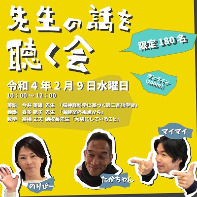 2月9日(水)10時より在校生保護者向けのウェビナーイベント、先生の話を聴く会を開催します。在校生保護者向けのイベントではありますが、今年度は本校の受験を検討していただいている皆様にも枠を設けましたので、ぜひご参加ください。内容詳細は以下の通りです。