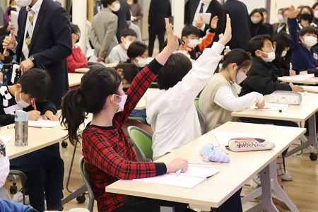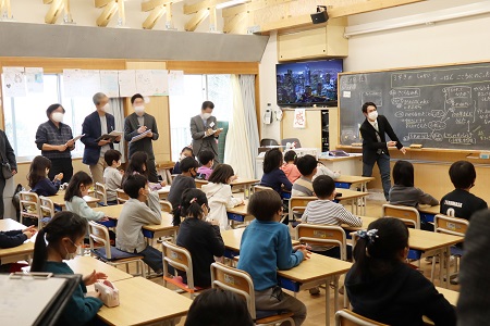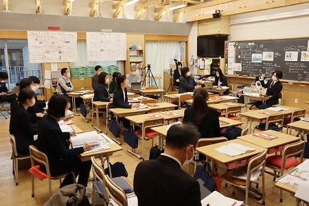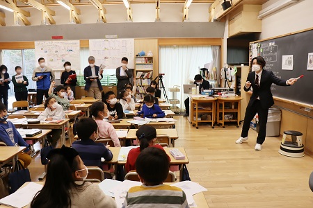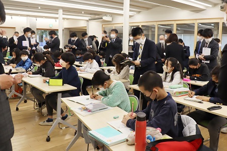 数学、社会、国語の公開授業と、その後に授業や教育法について参加者が意見交換する研究協議会を実施。参加者は子どもたちが授業に取り組む姿をじっくり観察し、ノートの取り方から考え方を探るなど非常に熱心に授業を見学されました。協議会では活発な意見交換が行われました。
