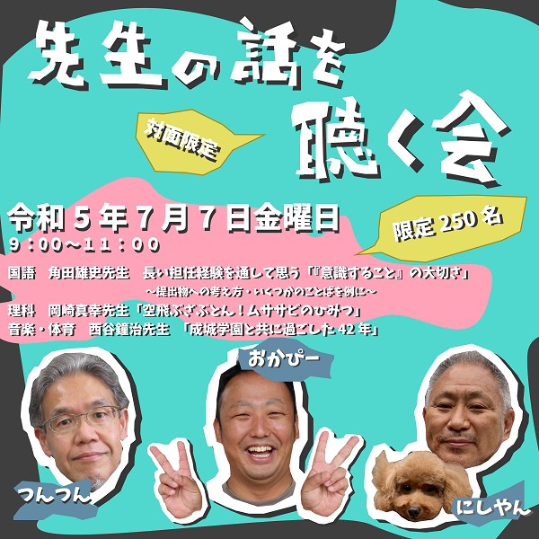 7月7日(金)に先生の話を聴く会を開催します。 先生の話を聴く会は、先生が興味関心があることや、これまでの教職経験を基に、各先生の個性豊かな話を聴いてもらう会となっています。 在校生保護者向けのイベントではありますが、受験希望の皆様と卒業生保護者の皆様のお席が確保できそうなので、ご希望の方は以下のリンクよりお申込みください。 申し込み開始日 6月30日(金)10時から 受験希望の皆様のお申し込みは こちらから 卒業生保護者の皆様のお申し込みは こちらから