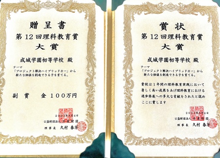 この賞は、公益財団法人日産財団による日産財団理科教育助成を受けた助成校を対象に、理科教育助成によって行われた研究の成果報告書を基に財団が評価して決定するもので、優秀な学校が「理科教育賞」として選定され、その中で特に優れたものが「大賞」となります。成城学園初等学校は「車を走らせよう」という大単元の総括である6年生の実践研究をまとめた「『プロジェクト解決ハイブリットカー』から新たな価値を創造できる子を育てる。」をテーマとした成果報告で第12回理科教育賞大賞候補の4校のうちの1校に選ばれました。