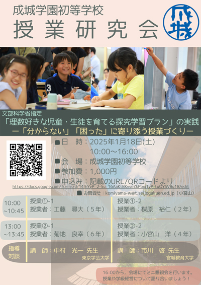 成城学園初等学校授業研究会 文部科学省指定「理数好きな児童・生徒を育てる探究学習プランの育成」-「分からない」「困った」に寄り添う授業づくり—を下記のとおり開催いたします。