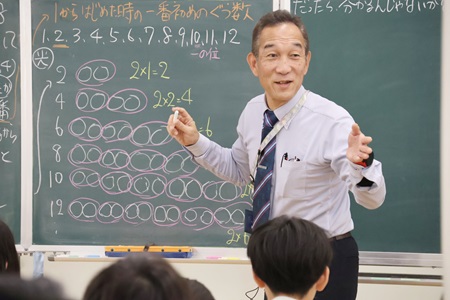 数学科授業Ⅰ 授業者:工藤尋大教諭(学級閉鎖に伴い、参加大学生の方に児童役をお願いしました)