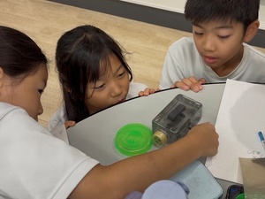 そんな今だからこそ、私達は学びの中に、デジタルではない「本物」に出会う機会を多く取り入れたいと考えています。例えば、1台の車の台車を試行錯誤しながら、様々な動力で実際に動かしてみる体験。学校の裏庭(地獄谷)に川を掘って流水のはたらきを考える体験。カイコを飼って観察しつつ「蛾にするのか、糸を取るのか」を悩み、考える体験。遊び道具であるコマを様々に変化させながら力やバランスについて考える体験。成城恐竜ミュージアムの巨大実物恐竜化石に触れて生命について考える体験。本物の化石の入った石を金づちと釘で割って化石を探す体験。夏の学校で海や山に行ってマイクロプラスチックや気圧の変化・野生生物について考える体験。花火づくり、火おこし体験、スモークの中で光の屈折実験、巨大シャボン玉・・・・あげればきりがありません。