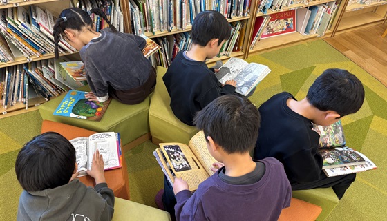 授業や日常の中で、本の紹介や読み聞かせの機会を設け、読書経験がゆるやかに交流する場を大切にしています。