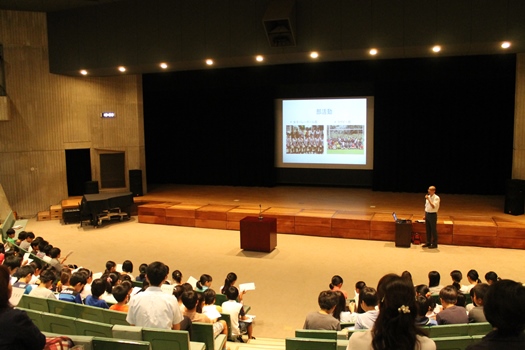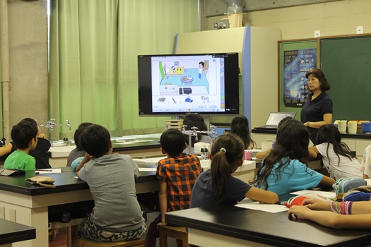 まずは初等学校の講堂に集合し、中学校の授業の様子を映像で見たり、中学校の先生から行事や部活動などについて話を聞いたりしました。その後、クラスごとに分かれて、英語、理科、社会の体験授業を受けました。各授業に共通していたのは、「中学校での勉強は、初等学校での学びがベースとなっている」ということ。中学校進学までは1年以上ある5年生にとって、初等学校での授業を今真剣に受けることが、中学校につながるという大切なことに気づくきっかけとなりました。
