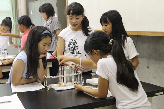 理科の授業では「酵素のパワーを調べてみよう!」という実験と標本室を見学。レバー酵素液にオキシドールを入れた試験管に火をつけた線香を近づけてみると…わぁ!激しく燃えてる!!