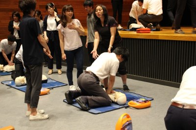 講習では、まずサッカーの試合中や海辺などで起きた事故現場の映像を見てイメージを喚起。その後、倒れた人の運搬、胸骨圧迫、AEDの使い方、人工呼吸を、訓練用の人形を使って体験しました。教育現場で、いのちを守る立場として児童や生徒と向き合っている先生方の目は真剣。2016年8月に成城大生が心肺停止に陥った女子高校生を実際にBLSで救命した事例を聞くと、ますますその重要性を感じたようです。